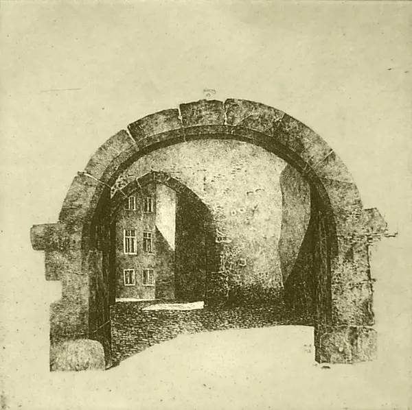 Walter Herzog, Radierung, Turmstufenpforte, 2007, Bildformat 28,0 x 30,0 cm, Papierformat 43,0 x 39,0 cm