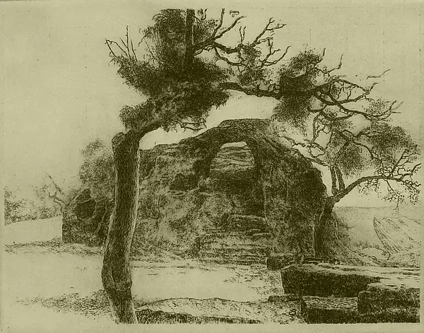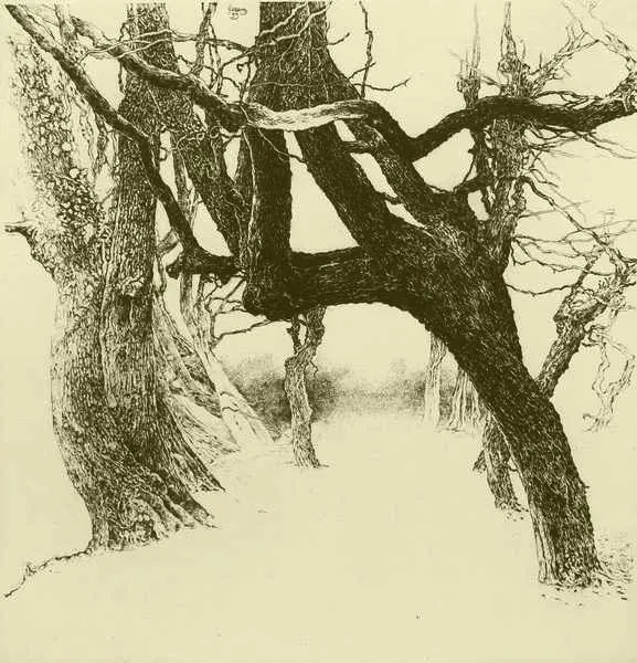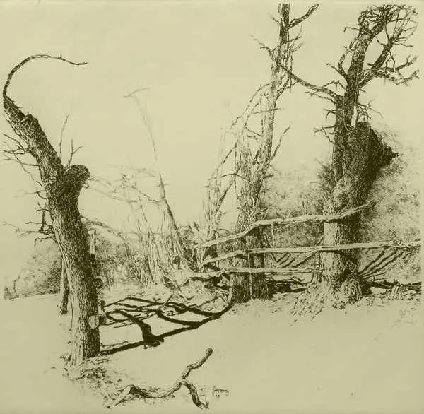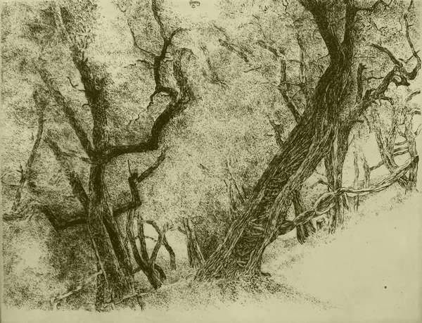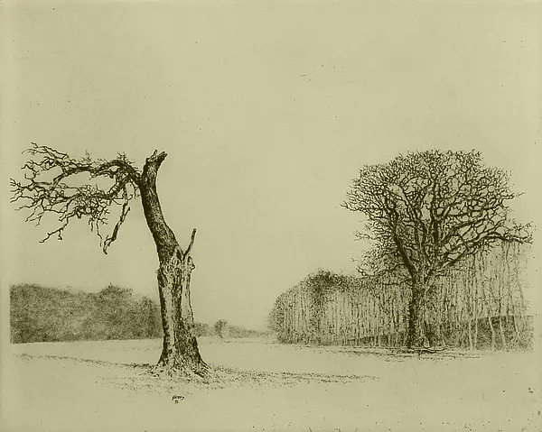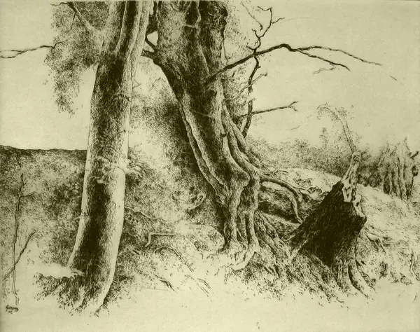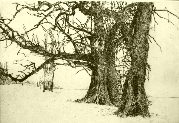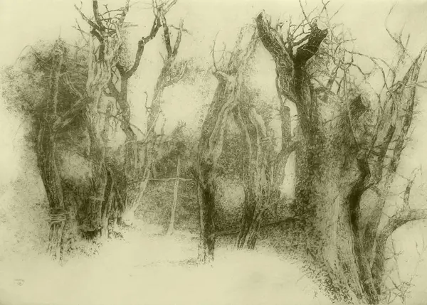 Walter Herzog, Radierung, Hermsdorfer Eichen, 2008, Bildformat 24,1 x 35,0 cm, Papierformat 39,0 x 49,0 cm