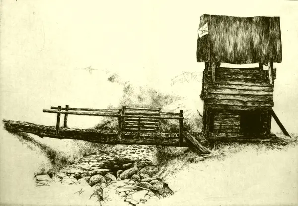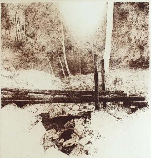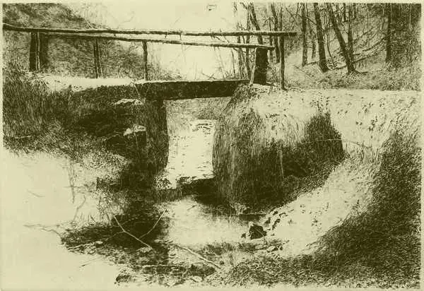 Walter Herzog, Radierung, Bachbrückensteg, 1997, Bildformat 26,8 x 39,0 cm, Papierformat 39,5 x 51,0 cm