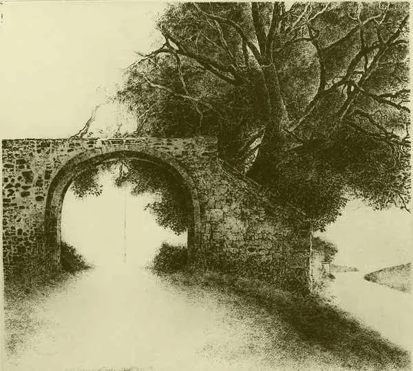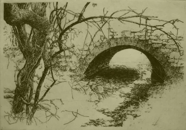 Walter Herzog, Radierung, Baum und Brücke, 2007, Bildformat 24,8 x 35,4 cm, Papierformat 39,0 x 49,0 cm