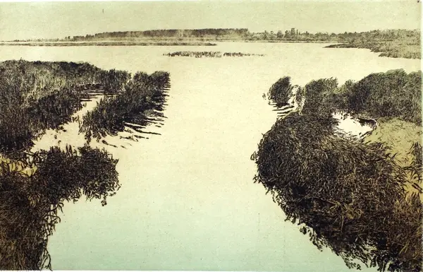 Walter Herzog, Radierung, Spreewaldwasser, 2006, Bildformat 29,8 x 35,4 cm, Papierformat 39,0 x 48,5 cm