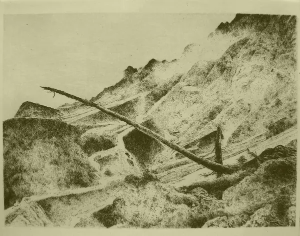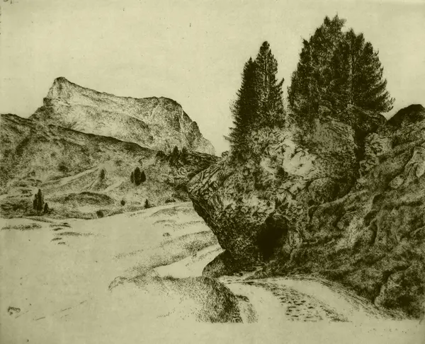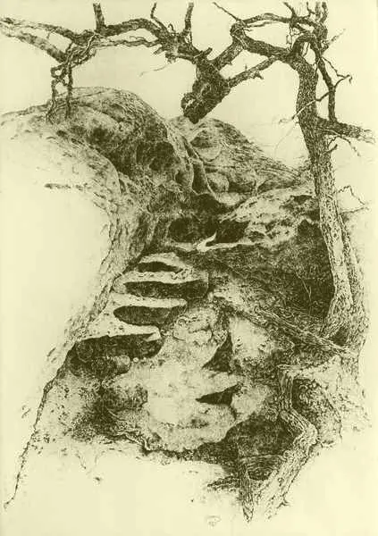 Walter Herzog, Radierung, Felsenstufenaufstieg, 1999, Bildformat 36,5 x 25,7 cm, Papierformat 49,0 x 39,5 cm