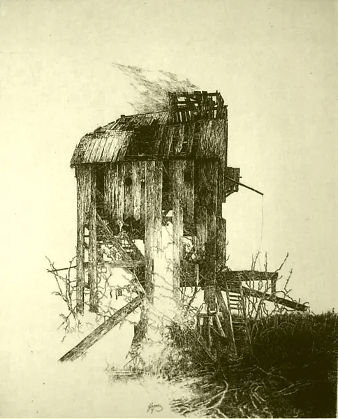Walter Herzog, Radierung, Mühlrad, 2008, Bildformat 27,5 x 26,5 cm, Papierformat 43,0 x 39,0 cm