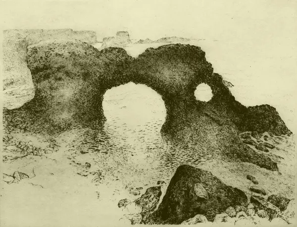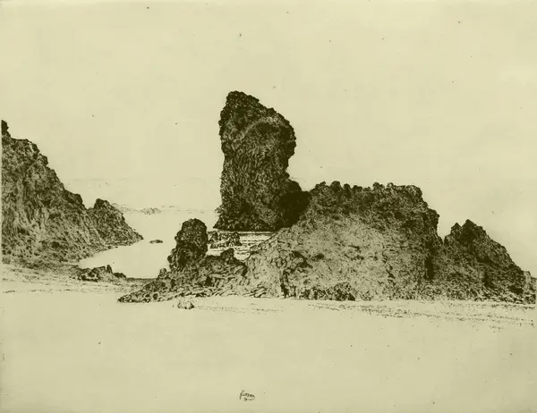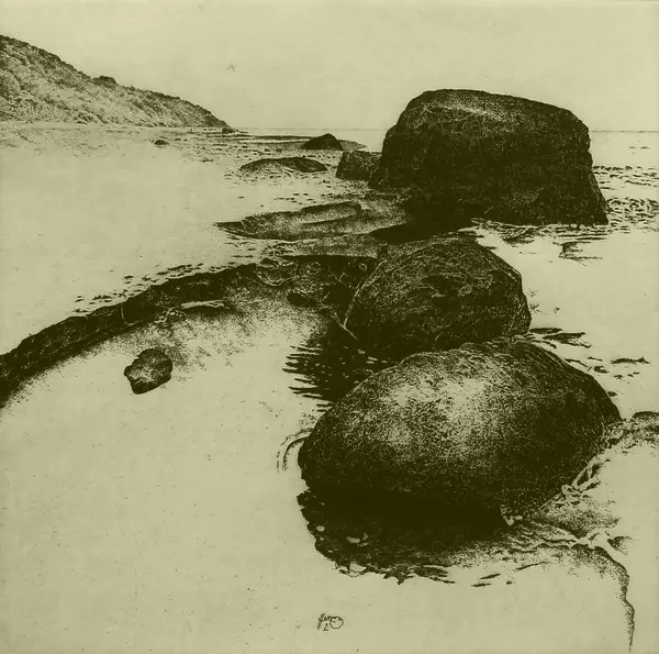 Walter Herzog, Radierung, Steinstrand, 1987, Bildformat 27,3 x 29,6 cm, Papierformat 39,5 x 36,0 cm