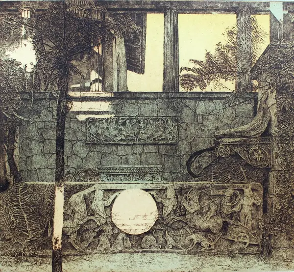 Walter Herzog, Radierung auf Farblithografie, Römische Bäder Sanssouci, 1977, Bildformat 24,2 x 26,5 cm, Papierformat 35,7 x 39,5 cm