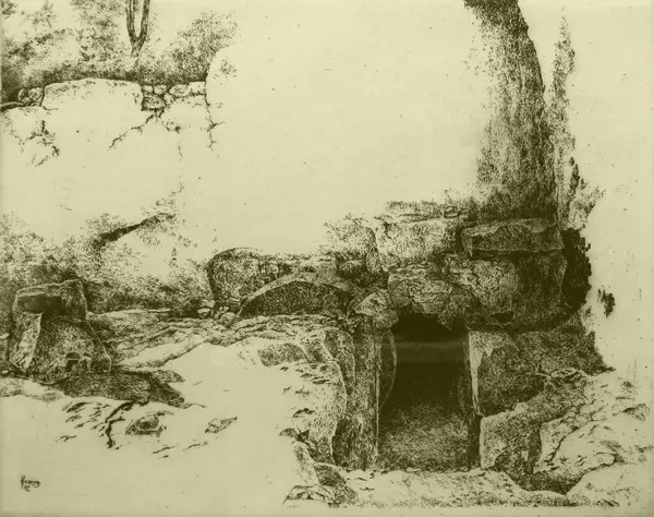 Walter Herzog, Radierung, Rollsteingrab, 2012, Bildformat 27,1 x 34,3 cm, Papierformat 39,0 x 49,0 cm