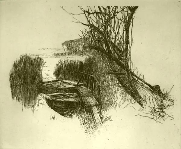 Walter Herzog, Radierung, Schilfbootssteg, 2007, Bildformat 29,8 x 36,2 cm, Papierformat 39,0 x 49,0 cm