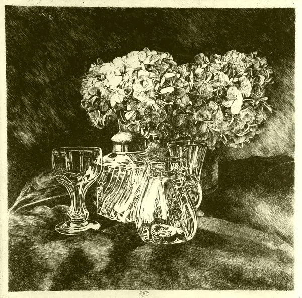 Walter Herzog, Radierung, Stillleben mit Hortensien, 2002, Bildformat 29,0 x 29,2 cm, Papierformat 42,5 x 39,0 cm